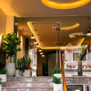 Ngay từ khu vực sảnh vào, điểm nhấn là hàng chậu cây dương xỉ được bố trí dọc hai bên cầu thang, tạo cảm giác mềm mại và dẫn lối khách hàng một cách nhẹ nhàng. Bên cạnh đó, các chậu cây lớn – nhỏ với hình dáng và kích thước đa dạng được đặt khéo léo quanh khu vực cửa ra vào, mang đến sự tươi mới ngay từ bước chân đầu tiên.